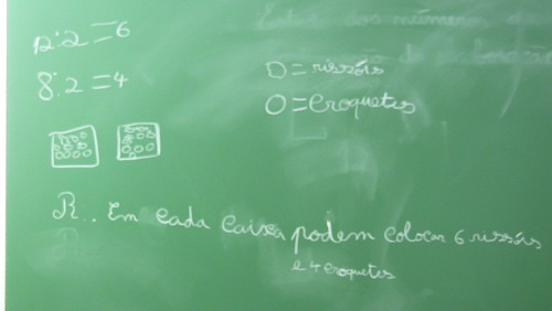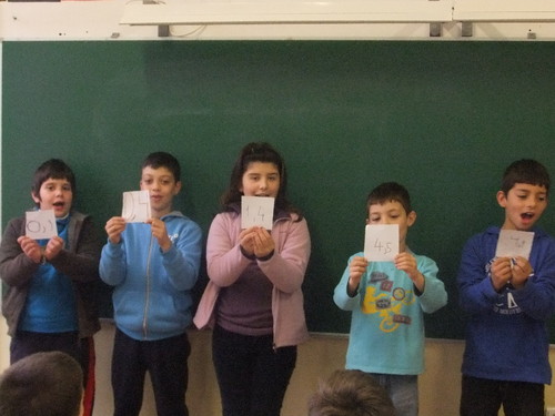 Para entenderem melhor e exercitarem a comparação e ordenação destes números, fizeram um jogo que consistiu em escrever num papel um número decimal à escolha que estivesse compreendido entre 0 e 5. Depois, uniram-se aleatoriamente em vários grupos e, entre si, ordenaram-se em sequências crescentes ou decrescentes, consoante a indicação da professora. Finalmente, foram para o exterior (para caberem todos uns ao lado dos outros) e repetiram o jogo, mas desta vez com todos os alunos e todos os números.